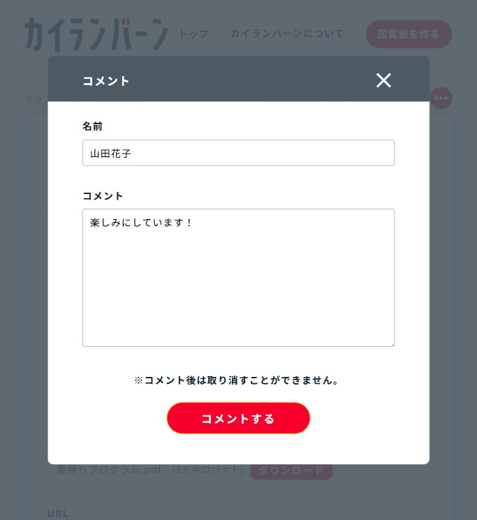 コメントする 2025.05.272025.10.02画面右上の「コメントする」をクリックするとコメント画面が表示されます。あなたの意見やフィードバックを、以下のステップで気軽に共有しましょう。目次➀「コメントする」 をクリック②名前とコメントを入力③コメント画面の「コメントする」 ボタンをクリック➀「コメントする」 をクリックまずはボタンを押して、コメント画面を開きます。②名前とコメントを入力あなたの名前とコメントを入力します。③コメント画面の「コメントする」 ボタンをクリック入力が終わったらボタンを押して、コメントを送信!※ 投稿後は編集・削除ができません。内容を確認してから送信してください。コメント