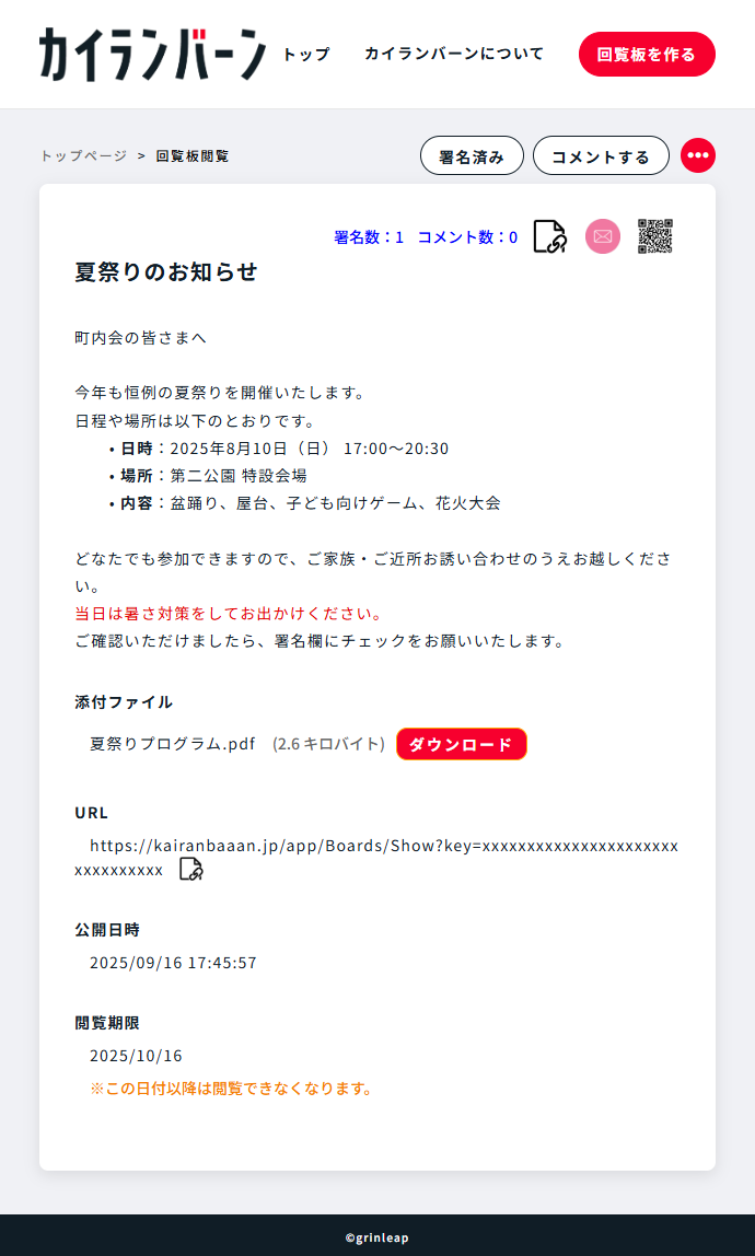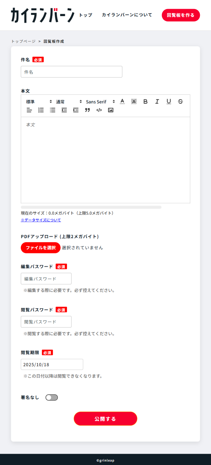 回覧板を作る 2025.05.262025.10.02画画面右上の「回覧板を作る」をクリックすると作成画面が表示されます。あなたの回覧板をサクッと完成させましょう。目次件名本文 PDFアップロード 編集パスワード 閲覧パスワード署名機能公開ボタン件名回覧板のタイトルを書くだけ。ひと目で内容がわかると親切です。本文 伝えたいことを自由に入力。太字や色づけで見やすくできます。PDFアップロード PDFファイルを添付したい場合、2メガバイトまでアップロードが可能です。編集パスワード 編集できるのは関係者だけ。パスワードで管理するから安心。閲覧パスワード「見せたい人だけに見せられる」安心のパスワード設定署名機能「読んだよ」の確認が欲しいときはON、必要なければOFFのままにしてください。公開ボタン入力が終わったらポチッ。これで回覧板がみんなに届きます。回覧板作成回覧板閲覧